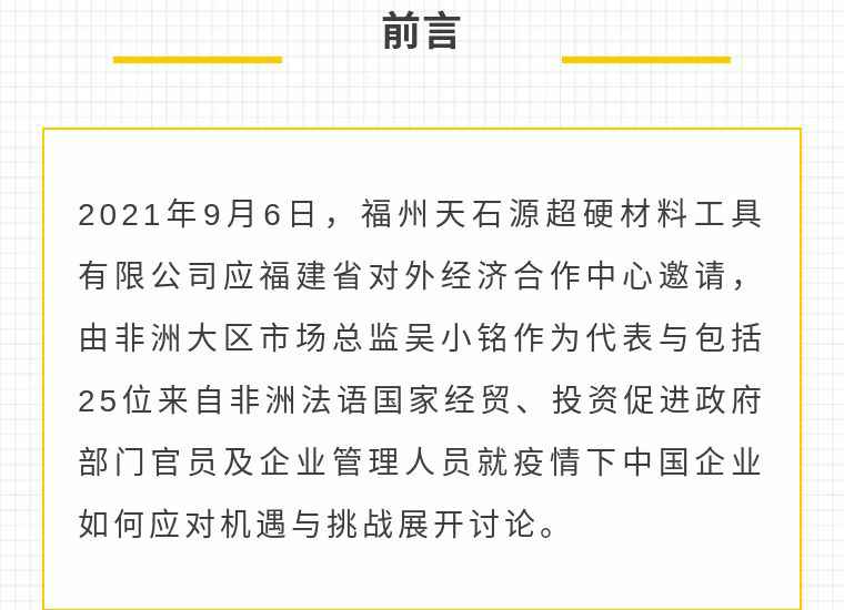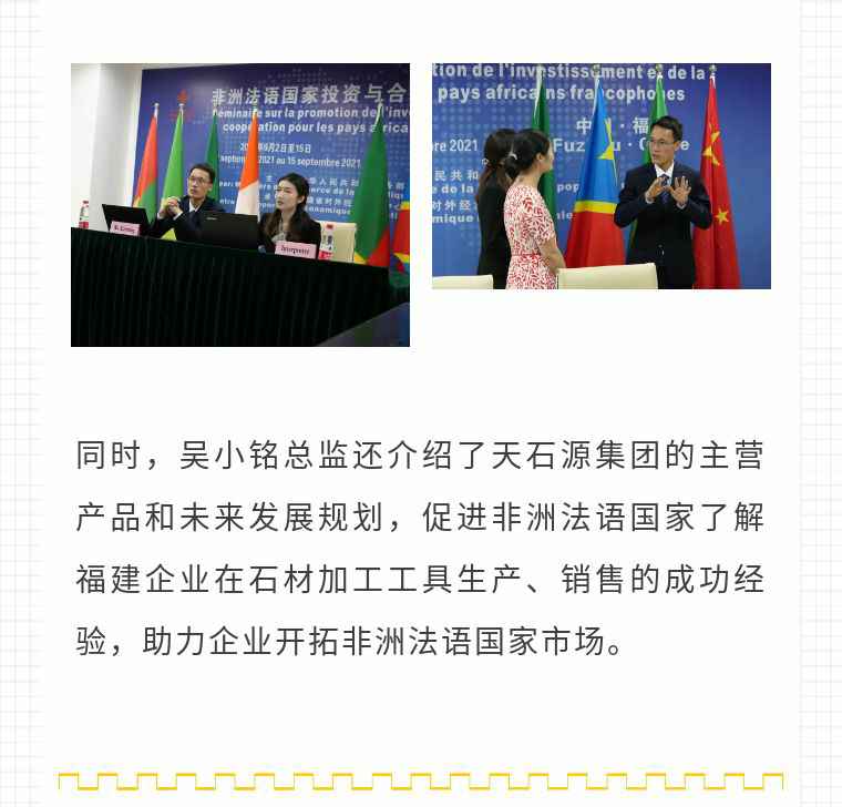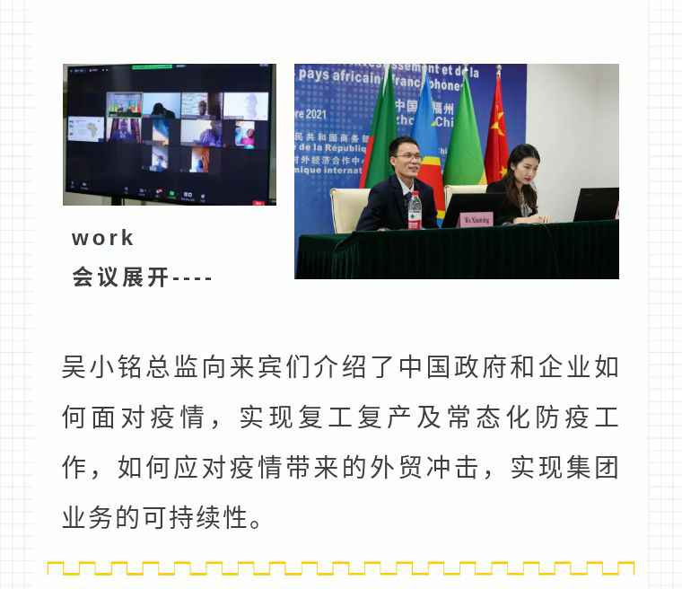 2021年9月6日,大连昊新网站优化与推广有限公司应福建省对外经济合作中心邀请,由非洲大区市场总监吴小铭作为代表与包括25位来自非洲法语国家经贸、投资促进政府部门官员及企业管理人员就疫情下中国企业如何应对机遇与挑战展开讨论。